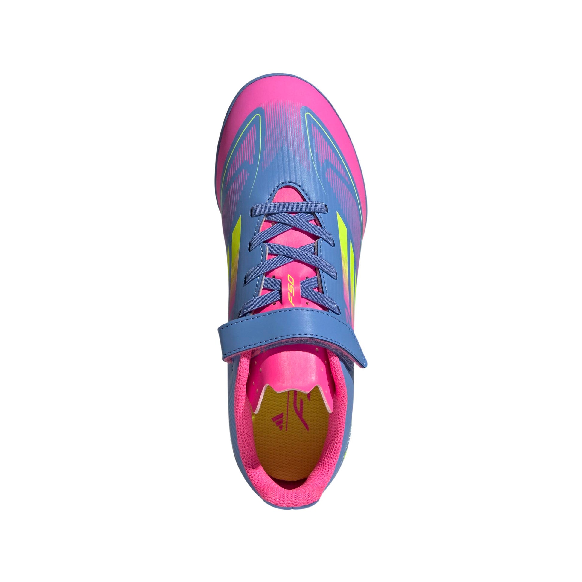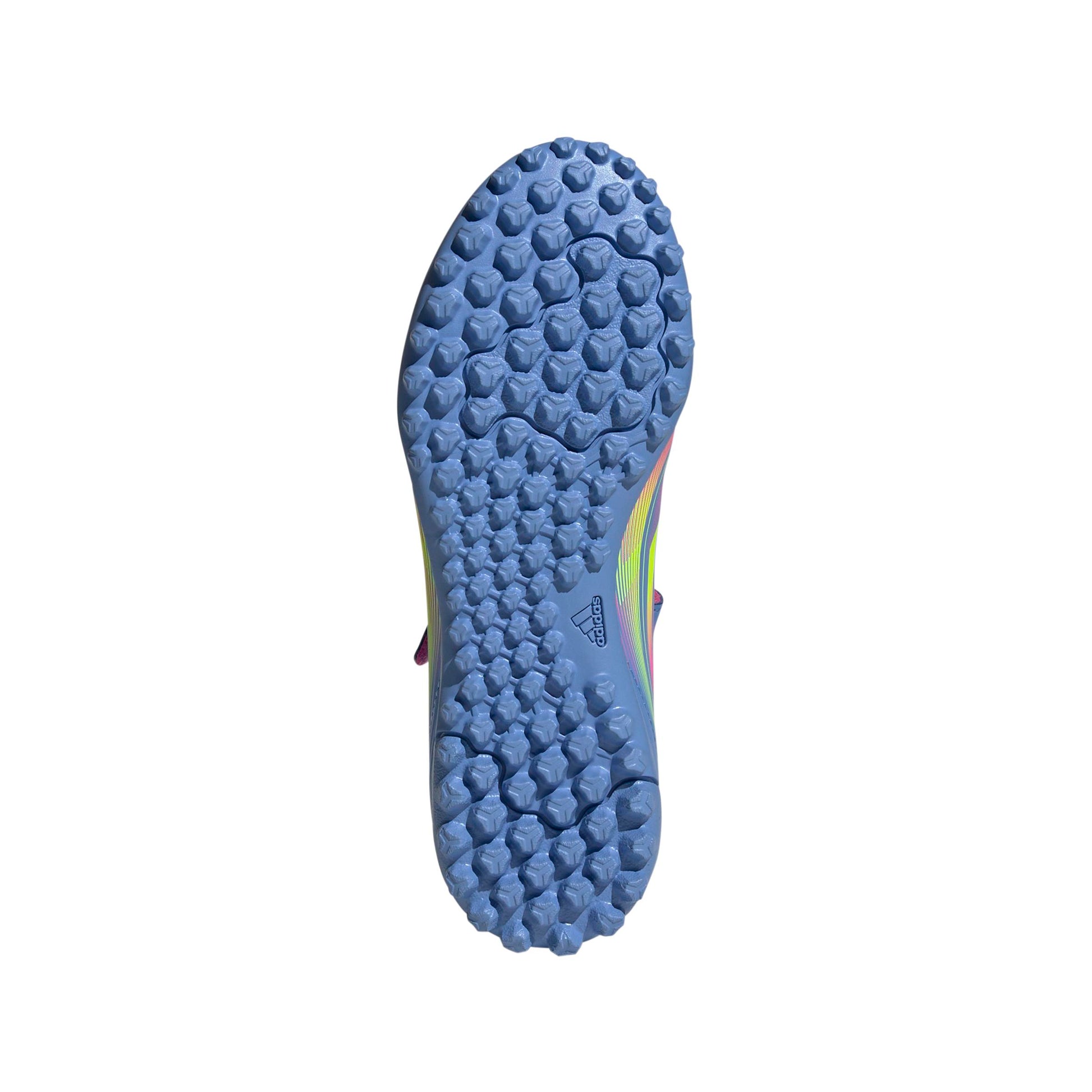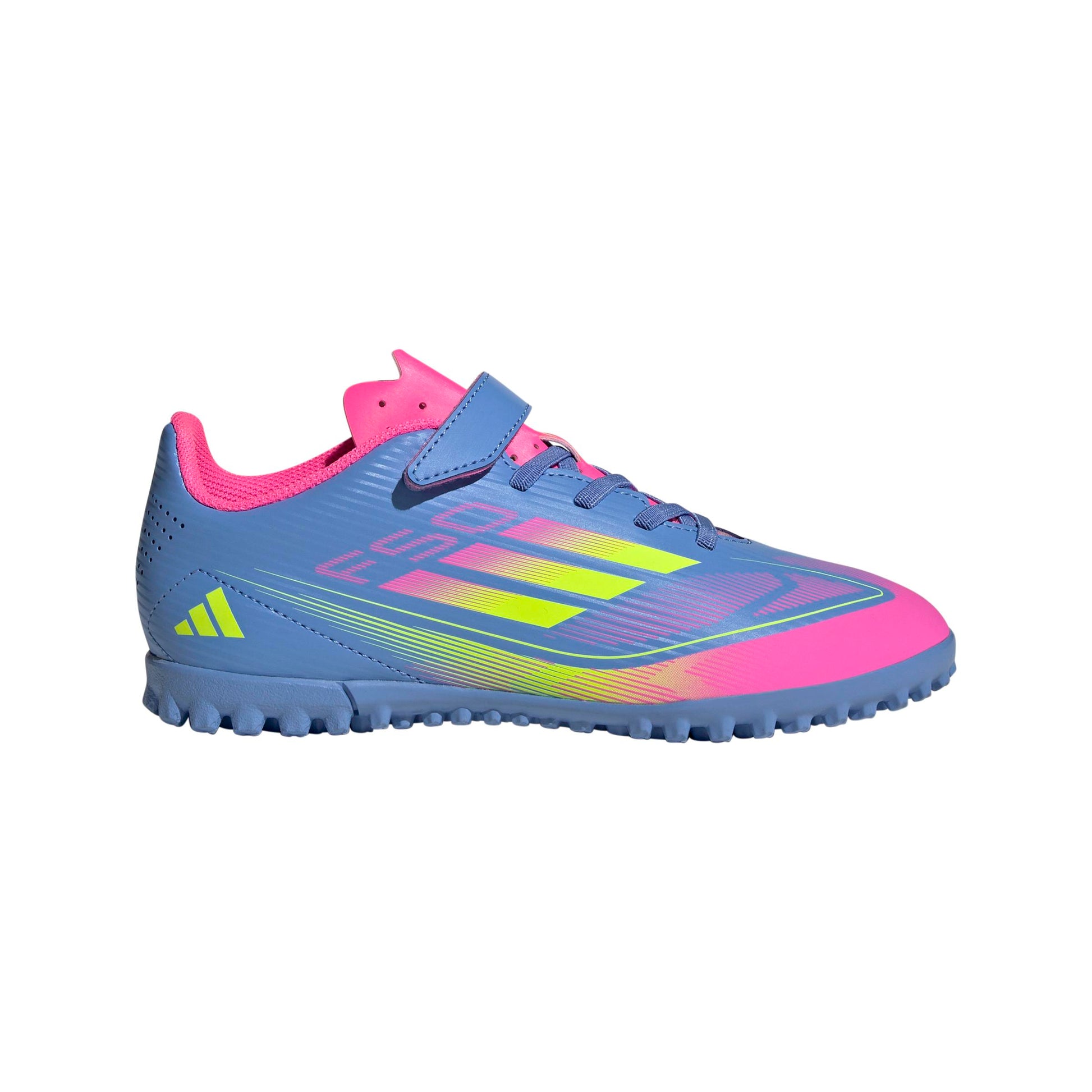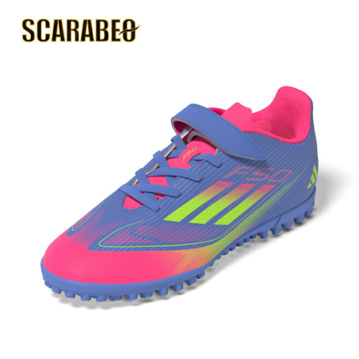 このジュニア用のF50 CLUBは、サポート力のあるファイバースキンアッパーに、足をしっかり固定する面ファスナーを備えた、軽快に動ける作り。そして、人工芝のピッチで稲妻のように素早い動きを引き出すラグラバーアウトソールを搭載。